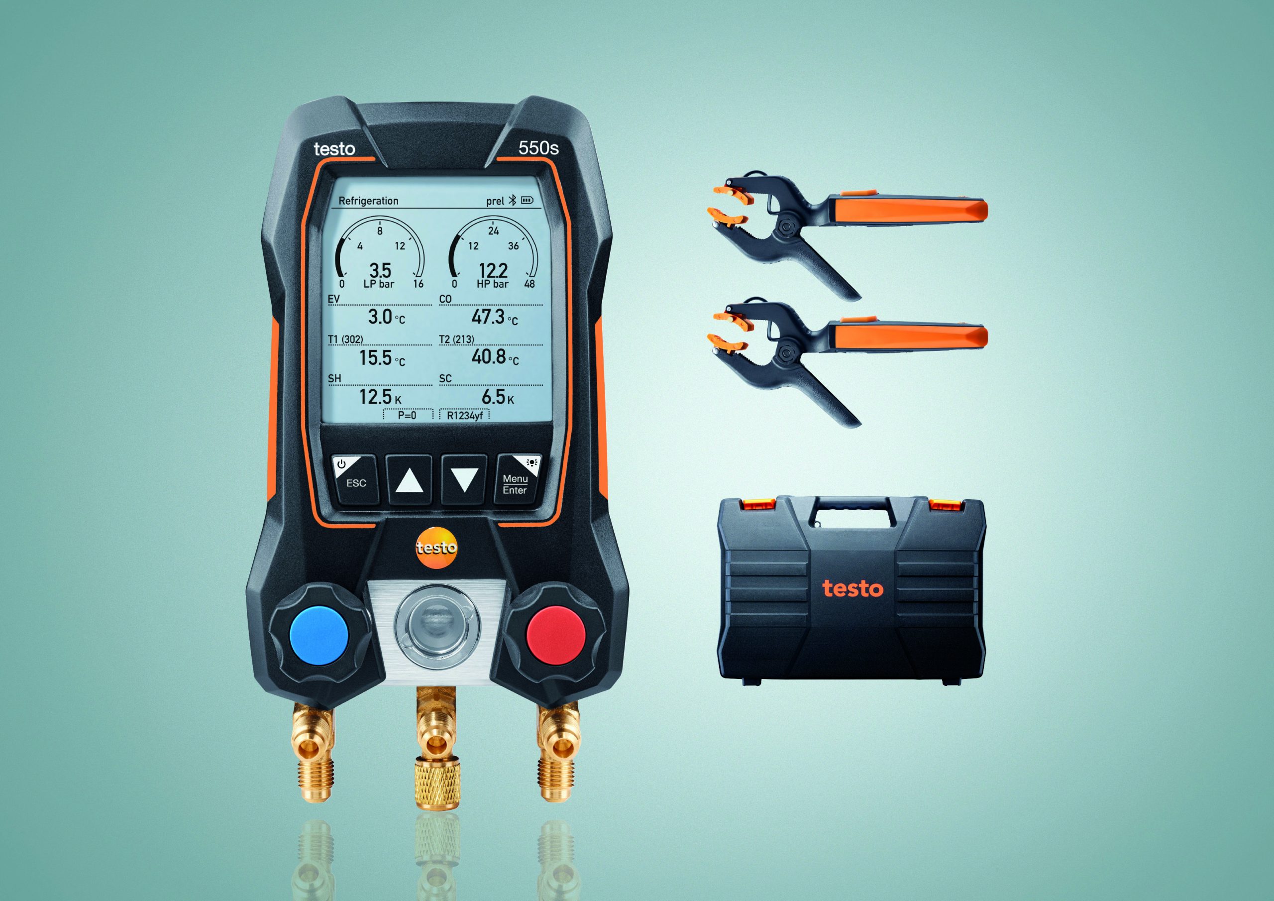 - In the kit: testo 550s smart digital manifold with Bluetooth and 2-way valve block, 2 x testo 115i wireless clamp temperature probes (Bluetooth, NTC), case