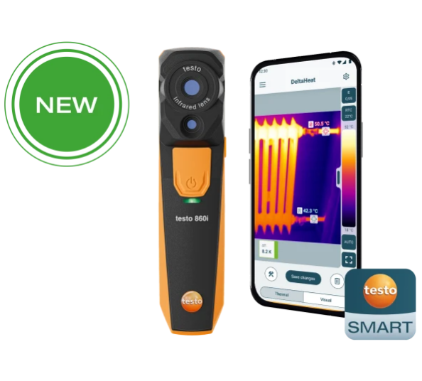 DeltaHeat for quick determination of the spread between the flow and return temperatures of radiators, DeltaCool for quick assessment of the temperature differential in refrigeration and air conditioning systems. The humidity mode function also helps to assess the risk of mould in indoor environments. The thermography measurement function shows hotspots and Delta T quickly and easily during maintenance.The testo Smart App is used to operate the testo 860i, display the thermal image and differential temperature, and for documentation – it’s simple, fast and smart. The testo 860i can be used flexibly, either directly attached to the smartphone/tablet for one-handed operation or separately. What’s more, its high suitability for everyday use, robustness and rechargeable lithium battery with a long operating time make the testo 860i a reliable companion.